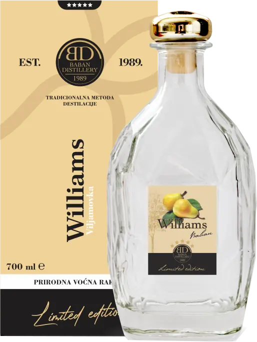 Baban Williams Limited Edition je rakija vrhunskog kvaliteta koja je odležala dvije godine u inox tankovima. Dolazi u ekskluzivnoj dijamant boci sa gift-box kutijom. Vrhunski kvalitet rakije uz premium pakiranje savršen je izbor za darovanje dragih Vam osoba.
